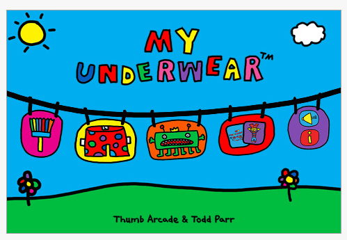 My Underwear is an arcadish game with activities of catching underwear, matching colored underwear or patterns of underware to colored or patterned animals. It increases slowly in levels of difficulty to provide appropriate trials for a range of kids (and some of us adults who like…) to play. It also has a visual memory matching game and a paint your underwear activity.