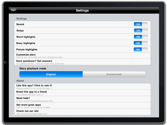 Some of their wonderful qualities of their apps are their clean presentation, wonderful, real images, ease and consistency of navigation and interaction in all of their apps. A huge bonus is the ability to customize within the app (yes, really – you can customize levels of skills of the app!! – I tell everyone because most people are not used to having the option available to them in apps!). Here is a typical example of the settings page where you can customize the the sound, word highlighting, story highlighting.