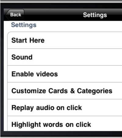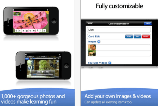 Customization in their apps differ from app to app depending on the content. Choices for customization may include selecting a range of pictures, categories or concepts, selecting specific attributes, choices of text labels or audio, level of difficulty, number of items will be presented or importing your own pictures into the app just to name a few. This apps customization allow you to choose video or pictures, use just upper case or lower case letters, choosing time of display, sound or mute and add your own pictures to the categories of animals by alphabet or create your own.