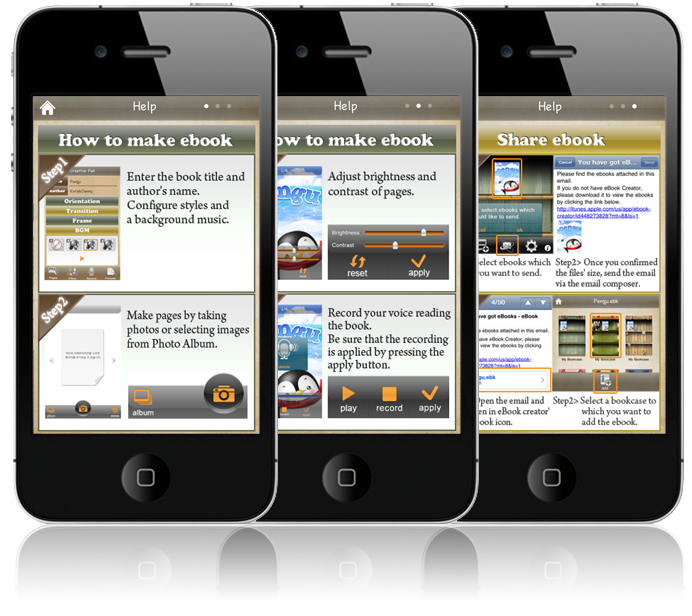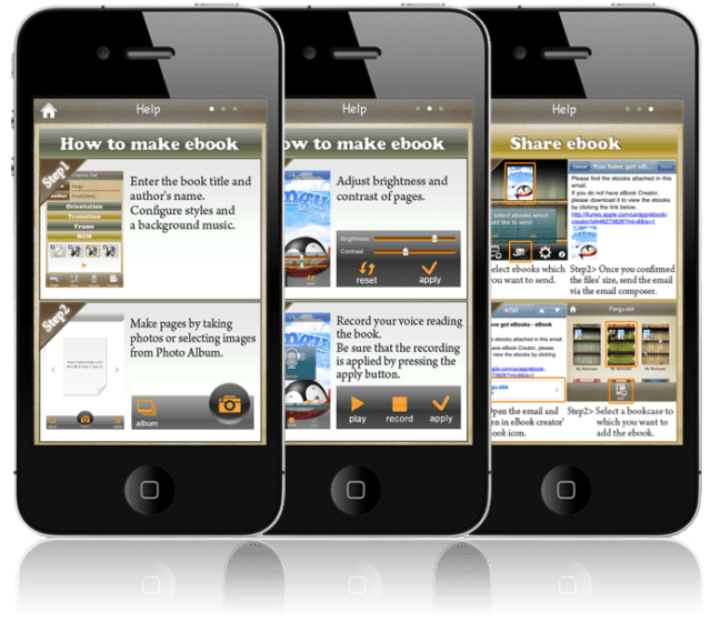 Ebook Creator is a low cost ($3.99) app for iPod/iPad/iPhone that imports pictures from you Photo Album as well as taking a photo within the app when creating an ebook. Easy to use this story telling app provides a recording feature to vocally narrate your story as well as the ability to type text in the story. Background music can also be played in the back ground if desired.