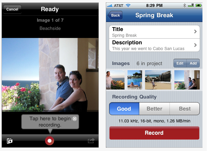 SonicPics ($2.99) for iPod/iPad/iPhone (a lite version is also available) which turns your pictures into a video. This app also allows you to share the video story you create with others and provides audio recording and inserting text in a slide/photo.