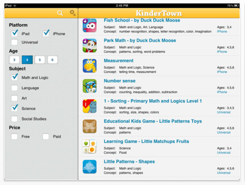 KinderTown is an app to help you search for the best educational apps for 3-6 year olds. It provides a searchable data base of apps that provide “substantial educational value” as reviewed by parents, teachers and kids!