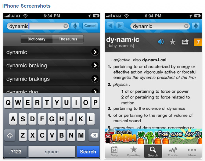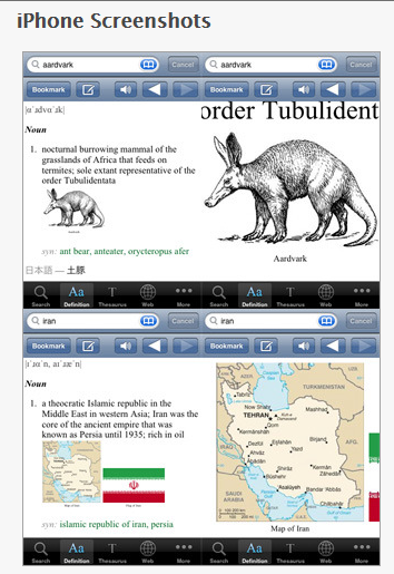 Dictionary – by Xyster.net another of the numerous dictionaries ($1.99) for iPhone/iPod and iPad provides 150,000 entries with links and illustrations. Dictionary does not provide a voice search, but does provide pronunciation of the word and bookmarks for frequently used words. Other features available include: