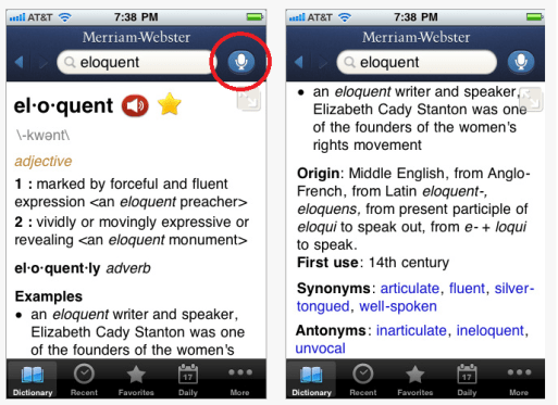 Dictionary.com’s dictionary and thesaurus tools I believe are more user-friendly however, navigation in Dictionary.com is not as intuitive as Miriam Webster’s Dictionary in my opinion. Both apps voice search was remarkably good using an adult voice.