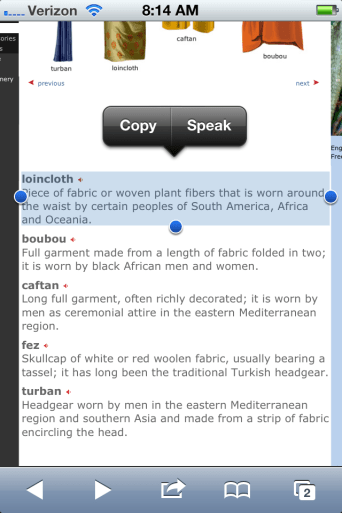 WordBook does not provide the tools to read the definitions, but using Voice Over (Triple-click turned on) allowed definitions to be read aloud. Although a smaller vocabulary base in this dictionary, I liked the ease of navigation and some of the other customizations and features provided in this app that could aid with some visual challenges and provide links to web-based tools. The other reference tools provided within WordBook all are linked back to WordBook app and would require additional exploration for their usefulness determined.