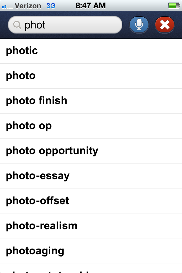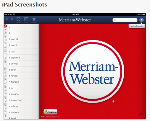 When I first started using my iPod several years ago, I was thrilled to be able to look up an unfamiliar word with my iPod Touch while in conferences or when reading. With several years and thousands of app developments later, the choices of dictionary tools have only gotten better with more choices and supports available for students with spelling, vocabulary and reading challenges. In the public school setting, we support our high incidence students with LD using many different devices. Spelling to look up a word is often a challenge. The portability and availability of apps on iDevices as well as cell phones provides wonderful tools in the hands of students as well as employees who have learning disabilities. A recent inquiry to one of my employment opportunities, Adaptive Technology Resources, requested mobile device for an individual in a work place who had spelling challenges with daily documentation . My first thought was the use of a mobile device, such as an iPod Touch or iPhone (carried in a pocket) to look up words using Voice Search, or creation of a favorites list of frequently used words that were difficult to spell.
