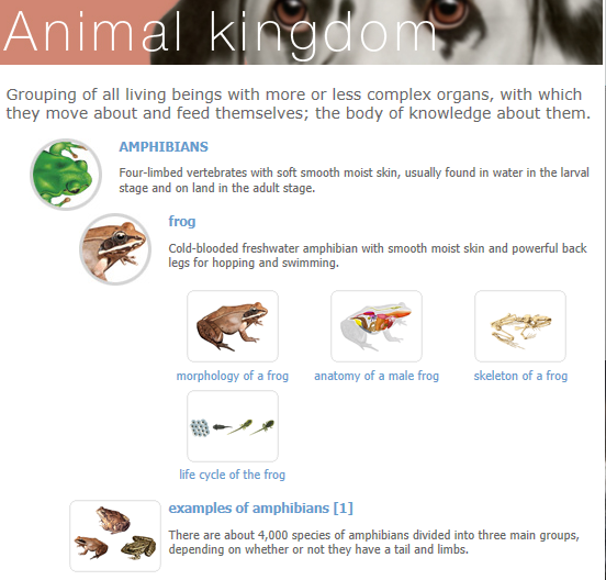 Visual Dictionary Online – The Miriam Webster Visual Dictionary is an online tool that provides 15 different themes or subject areas (Human Body, Animal Kingdom, Astronomy, Earth, Plants and Animals, Food & Kitchen, House, Clothing and articles, Arts & Architecture, Communications, Transport & Machinery, Energy, Science, Society, Sports & Games) and 6,000 images. By adding the Visual Dictionary Online as a Bookmark or using “Add to Home Screen” as an icon on your iDevice in Safari will provide you easy access to a pictorial dictionary for your students with Wi-Fi services. Here is an example of a visual dictionary entry when searching the Animal kingdom theme: