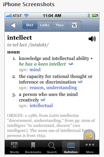 WordBook English Dictionary & Thesaurus – The WordBook Dictionary ($1.99 for iPhone/iPod; also available for Windows phone) has 150,000 entries with pronunciations for all words. pronunciations are available within the apps, not requiring Wi-Fi services for speaking pronunciations. WordBook is easy to navigate and provides tabs to navigate between a word entry dictionary thesaurus and other tools such as Wikipedia entries of the word. It also provides some word suggestions when typing in a word almost like word completion/word prediction without a phonetic base (see WordBook XL below).