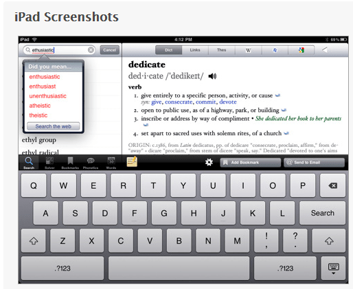 A post in appadvice.com, “ Best English Dictionary Apps: iPad/iPhone Apps AppGuide” provides a great listing of dictionary apps. Research and trial of many of the additionally listed apps finds that many of them do not have speech pronunciation available or some may have it but requiring Wi-Fi service to function. In my opinion the dictionaries are only accessible if they talk aloud to support most of the students I service. Certainly Voice Over can be used with these dictionary apps however a quick look up with the pronunication readily available is preferred in my mind.