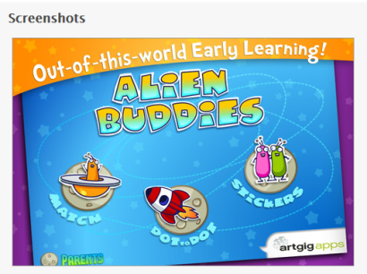 One app, Alien Buddies is a free app today only (I apologize for the late find!) for young children ages 3-7 with activities focusing on: