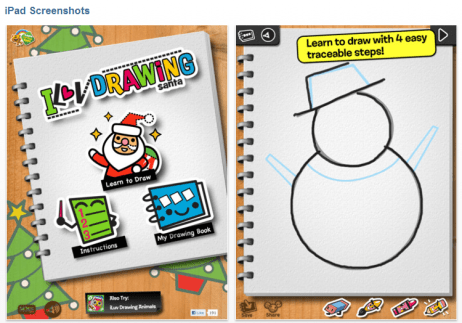 Learn with Fun Apps also is the developer of the iLuv Drawing Santa app previously reviewed in an earlier posting on holiday apps. With the same kind of step by step drawing instructions, this app provides great seasonal visual motor activities with models of christmas tree, snowman and bell and other season items to draw through the winter months. Made for the iPad and also currently free!