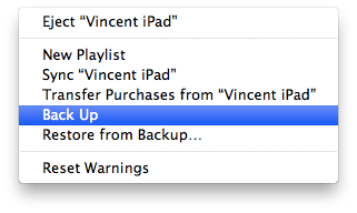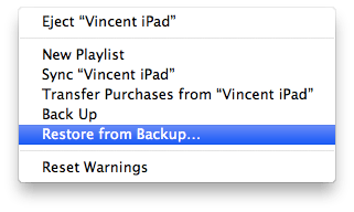 After back up is complete, Melissa will disconnect the master iPad. Then, she’ll connect one of her other four iPads, right-click the iPad’s name in iTunes’ sidebar, and choose Restore from Backup.