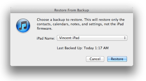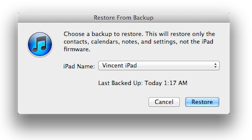 iTunes will ask Melissa to choose a backup to restore onto the current device. She’ll of course choose the backup of the master iPad.