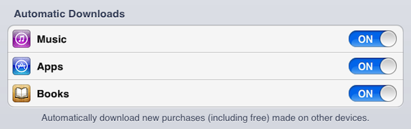 It’s very convenient to enable Automatic Downloads of apps in the Store section of Settings on iOS devices. This automatically downloads new purchases (including free) made on other devices and in iTunes. You just need to be signed into the same iTunes account on all of your devices. Don’t worry; you don’t have to input the account’s password each time an automatic download happens (that would be annoying).