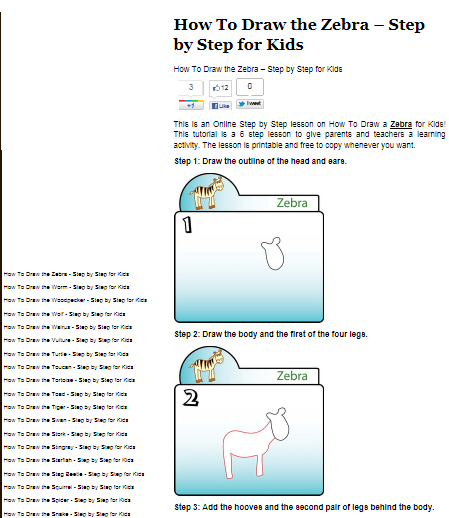 • Locate websites that supply you with step by step drawing instructions. One such website is Drawing for Kids.net. If Wi-Fi is always readily available to you, bookmark the website or add it to your home screen for easy access. If Wi-Fi is not consistently available, take a screenshot (press home button and power button simultaneously – stores a photo of the screen in Photos) of the webpage(s) (if legally reproducible) and organize them in an Album in your Photos. You can present the photos of the step by step instructions to your students for them to can copy and draw on hard copy. Drawing for Kids.net has free, reproducible, 6 step instructions for drawing animals . They have extensive step by step instructions on over 80 animals on their website.  Here is an example of their instructions: