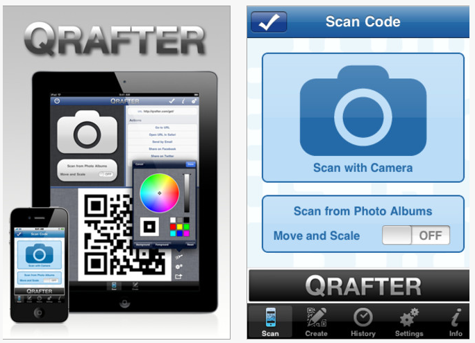 Qrafter – Pro version creates QR codes (2.99) and standard version is a reader (free). Many different types of information can be utilized in a QR code including URL’s for YouTube, map info, addresses, phone, email and much more allowing QR code readers to be used to supply information on many types of information. I found the most success with Qrafter app.