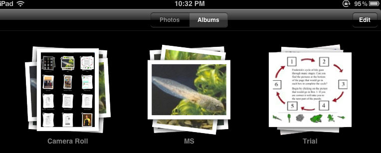 I wish I was as smart as our Paraprofessionals (Tara, Olivia) and COTA (Erin) at the school I work at! They demonstrated at a training how they have been creating Albums to show sequences of tasks or events, scheduled tasks (yes, just like using a visual schedule) for students using photos taken on the student iPads with iOS 5.  Although we have some  First Then apps on some of the iPad, not all of the devices were provided the app. But being the mother of necessity they created their own way of producing a visual sequence of photos for their students.