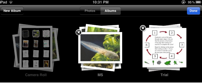 I also like creating Albums with groups of worksheets or handouts of a theme or activity type that I may have found on the Internet. Taking screen shots of online free materials I might use with some students provide easy access, organization and display on my iPad without carrying around folders and hard copy paper.