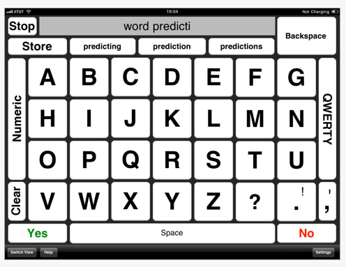 iMean – Another app providing word suggestions with an alternative keyboards available with text to speech capabilities. Compatible with the iPad (4.99), this app provides options of an ABC, QWERTY and number keyboards with word suggestions  and text to speech available when the word enter the typing window. Easy switching from keyboard to keyboard is available directly on the keyboard.