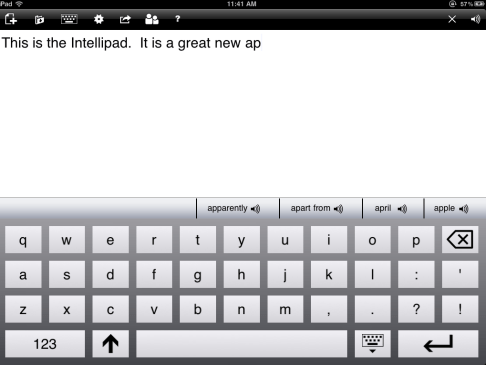 Intellipad App – This word prediction and customizable keyboard app provides many options for students with special needs. Compatible only with iPad (19.99). Intellipad provides a word processing environment with word prediction presented above the keyboard for easy viewing and selection. Word prediction is generated alphabetically as you type. Text to speech is also provided for easy auditory review of the text. This is a great app for elementary aged students with learning disabilities who have difficulty generating written work. Working with the app to become familiar with it I easily customized a math keyboard with math symbols as a solutions for students having difficulty handwriting simple math problems.