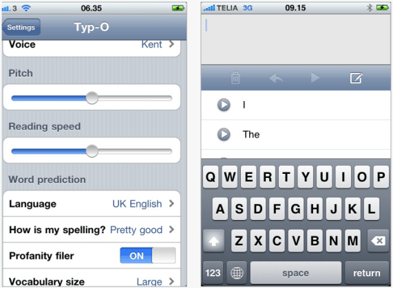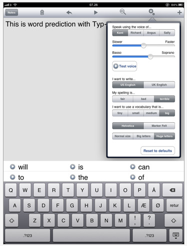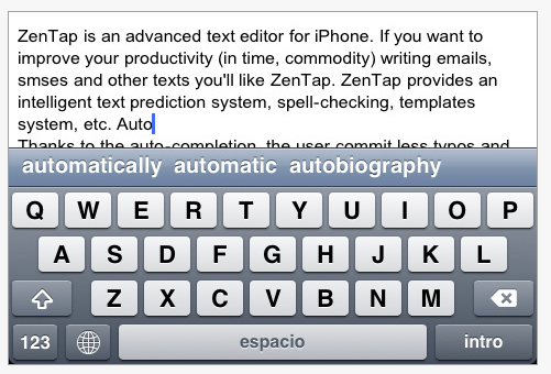 ZenTap – A word processing app featuring advanced word prediction.  Compatible with iPhone/iPod and iPad provides a free and Pro version (2.99), ZenTap provides a word processing environment with word presented above the keyboard for easy presentation and access. Words are predicted using an alphabetic formula, rather than a phonetic or grammatic method of generation.