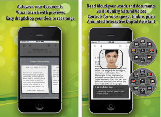Write & Say App  – This app provides a word processing environment with text to speech, translation and the ability to convert your text to MP3 format. Many languages and voices are available within the app. Boost high quality voices for its text to speech tool. Compatible with iPhone/iPod and iPad, (9.99). Provides the ability to email your documents.