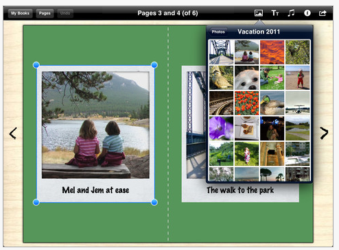 Story Buddy 2 is another story telling or book creating app available for the iPad (4.99). This produces a beautiful, polished book in a slide show presentation using photos from your photo album and adding audio and text. Story Buddy provides different background choices,  styles for text and picture presentation. More than one picture can be added to the slides providing some nice options for presentation.  An audio recording tool is available, however  I did find this could be somewhat finiky at times.