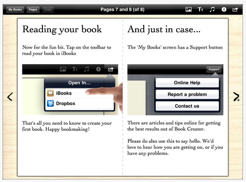 Book Creator has many options and working with it has options to create your own textbook using its many tools. Although not interactive allowing movies embedded in the book, it does provide a published look to it. Not quite as polished as the final product of Story Buddy 2 due to their choices of backgrounds and picture presentation, but Book Creator provides the ability to one touch open the finished product in iBooks, or Free Books app for viewing which worked immediately. I was able to view my book in iBooks with audio working and the ability to read the text using the speak text feature of iOS5. When sent to iBooks this text is unable to be altered but also unable to easily be trashed or deleted by a student unless they perform an edit in iBooks.