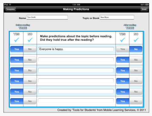 Tools4Students is a free app made by Mobile Learning Services for the iPad.  It provides 25  different graphic organizers used for writing, summarizing, comparing, work work and other study strategy used with or by students.  Here is a list of the organizers in the app: