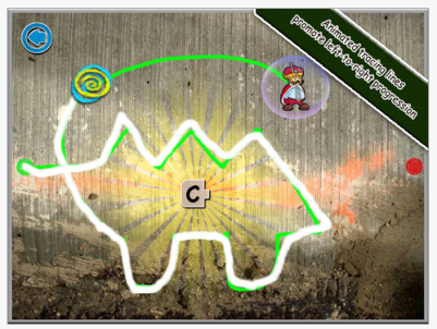 Chalk Walk is a dynamic activity requiring maintenance of the pincer hold to make the line and constant motor planning and visual attention to observe where the line is being drawn ahead of you. Working on an easeled surface may help somewhat with being able to view and follow the animated objects pathway. Not for beginners, this app would be suited to primary aged students who can maintain a pincer grasp and have the control to change direction of drawing somewhat quickly. Users would also need to have fairly good somotosensory awareness of their hands and fingers to guide their hands on a pathway that is not always so visible.