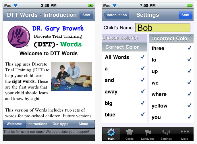 DDT Words for iPad/iPhone app is one of a series of apps developed by Dr. Gary Brown using Discrete Trial Training, an ABA treatment method. This free version includes 39 sight words for preschool children and provides customization of word lists, methods of presentation and collection of student data. Additional word packs for kindergarten and 1st, 2nd and 3rd grade levels are in app purchases (2.99 each). Instructions are provided in the introduction of app. Here are some images of the instructions and some of the word selections in the iPod/iPhone app: