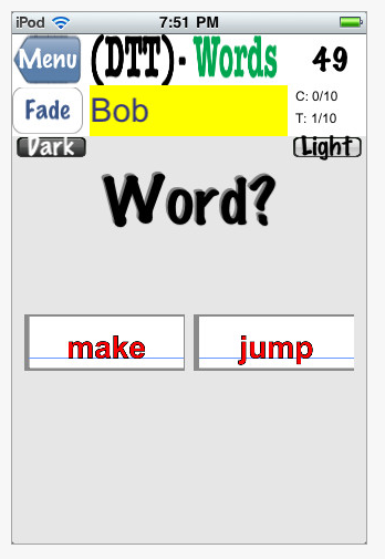 Instruction to the student is provided verbally in the above screen for the student to identify the word. Results of percentage of accuracy and words accomplished are provided in a listing in the app. Although different students names can be listed in the app and results gathered there is not a method of creating lists of different students within the app. If used by different students, settings need to be reestablished with each use and data collected is accumulates in one document.