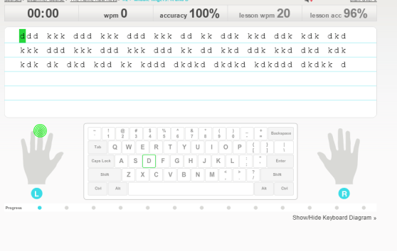 Typingweb.com provides progressive keyboarding instruction starting with home row keys and displaying proper fingering when keys are introduced. This keyboarding instruction is broken down step by step using a standard keyboard instruction with practice sessions to build technique, keyboard layout, speed and accuracy. It also collects data on lessons completed, speed and accuracy of your typing.