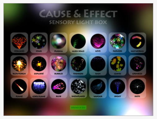 Cause and Effect Sensory Light Box (1.99) for iPhone and iPad was created for a group of teenagers with complex needs including visual impairment, autism and developmental disabilities. With 21 different scenes with abstract visuals and quality audio the app encourages development and basic awareness of touches and gestures through open-ended exploration and play.