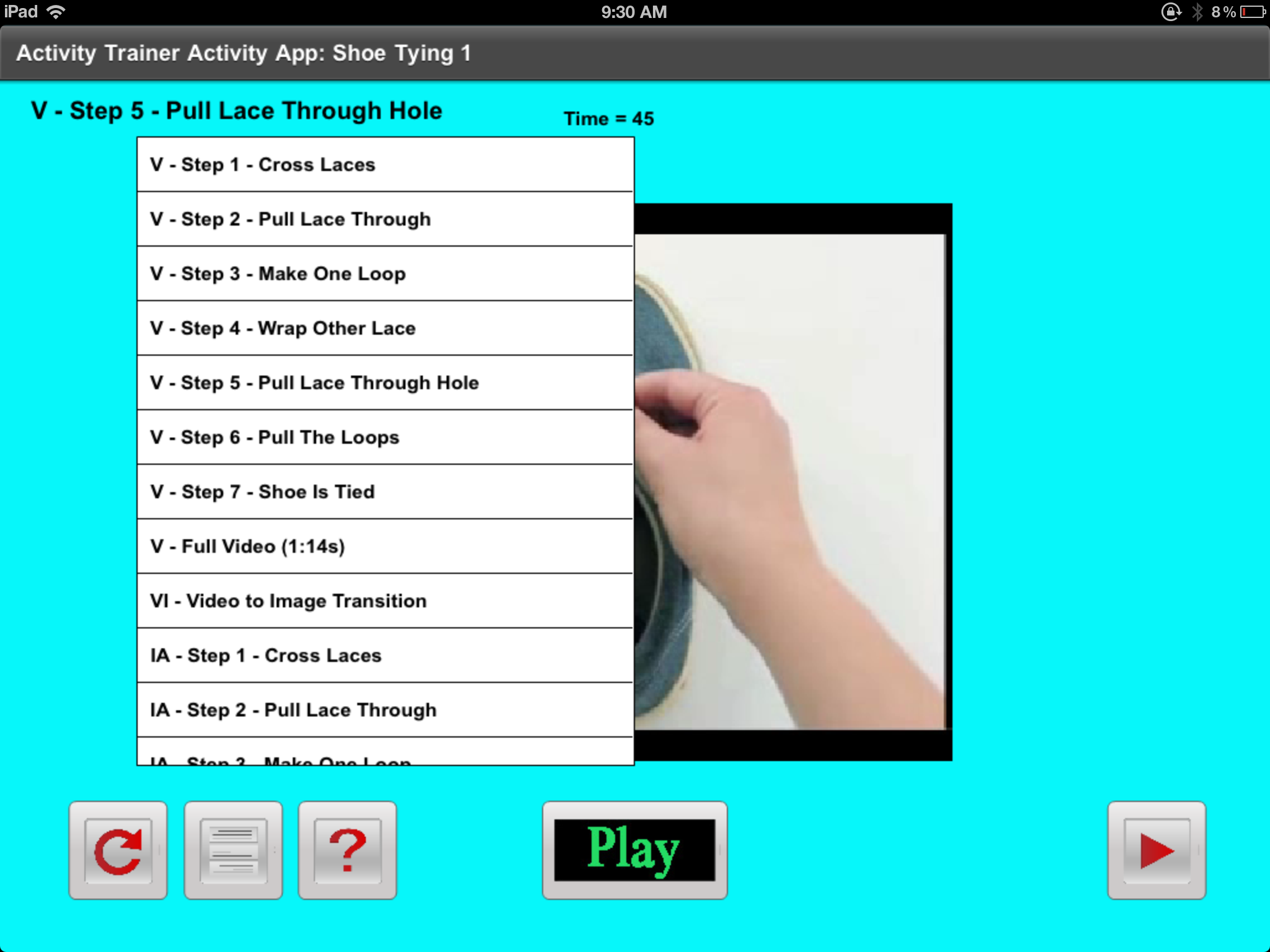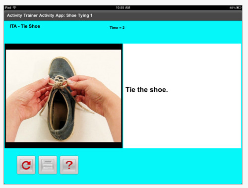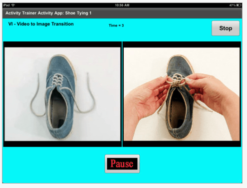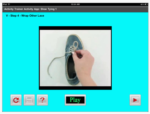 Shoe Tying 1 – Activity App ($4.99) for iPhone/iPad provides explicit instruction of shoe tying single loop method (off foot) in a variety of multi-media presentations including video, images, text and audio as options for instruction for the user. The presentation menus provide a listing of the 7 steps to shoe tying with choices of presentation, by V – video, I  – image,  A – Audio, T-Text or any combination of those modes allowing support as uniquely needed for the user.