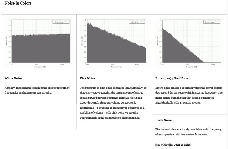 White noise defined also called white sound and is a steady, unvarying, unobtrusive sound, as an electronically produced drone or the sound of rain, used to mask or obliterate unwanted sounds, or scientifically is random noise with a uniform frequency spectrum over a wide range of frequencies (dictionary.com). Similar to white light and is a combination of all noises randomly presented. As in the app reviewed above there are also color noises, some being more noisy than others. Visit Colors of Noise wikipedia article for noise colors information (did you know there also are blue, grey and violet noise too?). Here are some visuals of white, pink and brown noise from White Noise, Oh So Lovely and her thoughts on white noise to de -stress.