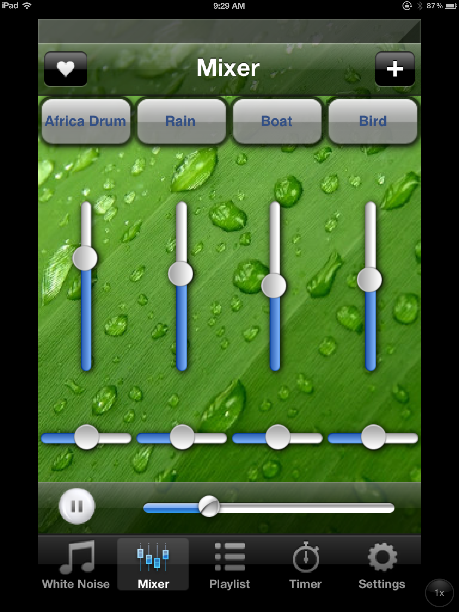 The sounds can be mixed (Mixer), timed and saved for customized sound mixes. Your customized mixed are saved in Play Lists providing unlimited (almost it seems) choices of mixed sound set to your preferences and perhaps your moods. Other options available include volume control and quantity of time for each sound mix and the ability to edit those settings. A timer option provides the ability to set the amount of time of your mix and allows fading out choices of 5 seconds to 3 minutes. Here is an image of a sound mix and the editing settings available (amount of time and sound level for each sound):