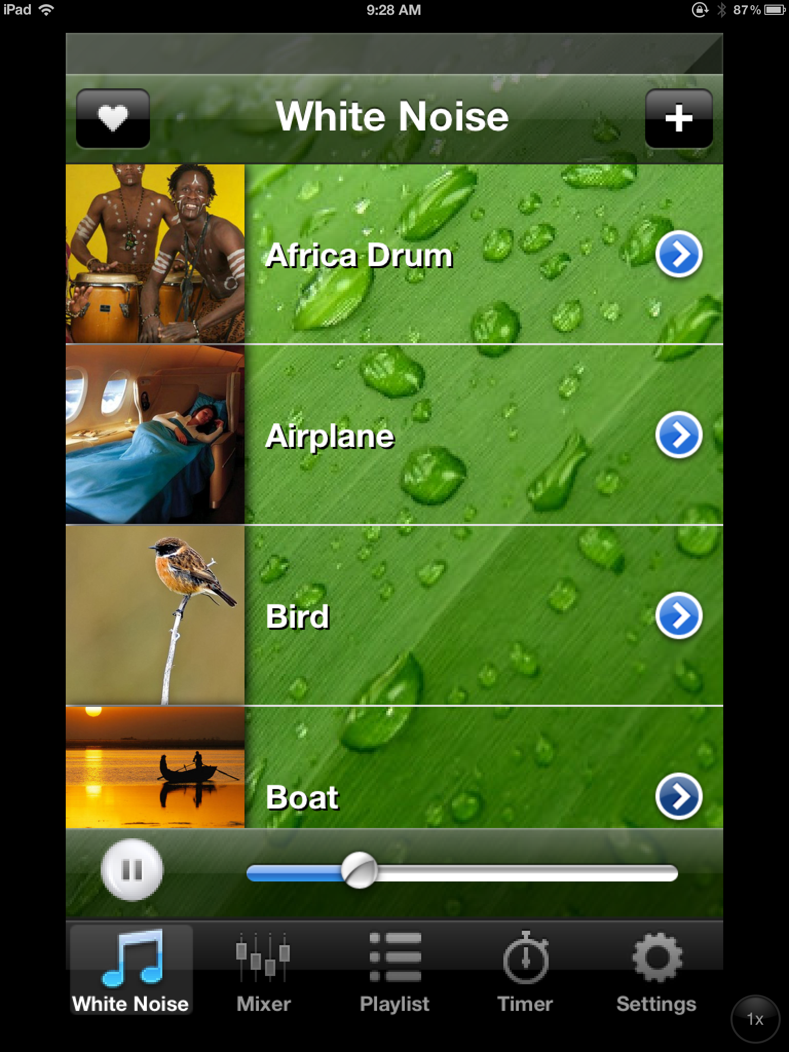 The app is loaded with white noise sound selections (not complete list):
