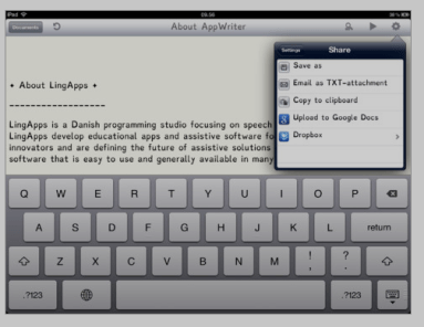 AppWriter, an iPad app developed by LingApps features text to speech, basic word prediction and a very easy interface. It is a favorite of mine however its regular price of $19.99 made me think twice about purchasing it (although I did without regret!). As a back to school sale LingApps has reduced to $12.99, a pretty good deal for this easy to use app easily used as assistive technology for elementary to middle school or older students.