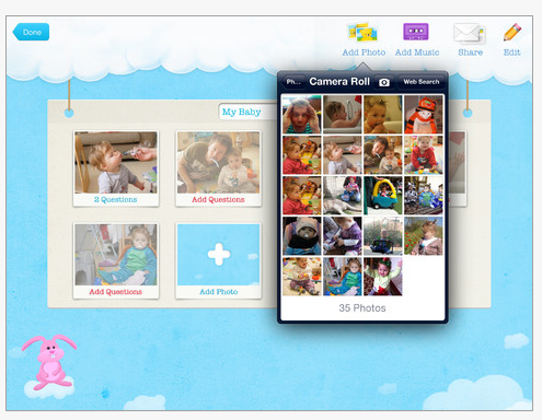 Geared to users who perform best with audio and image support (no text option is currently available) and physically interact with the touch screen, Tiny Tap allows you to create a “game” or questions about a theme or any variety of pictures from your photo album or camera. Steps to creating in Tiny Tap involve choosing an image or pictures of objects or vocabulary that response to questions of “show me”, “where is the ___ ?(object)”, that the user can relate to. As shown below, images can be easily added from the camera or from your iPads Photo Album.