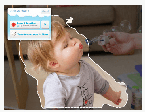 The next step involves recording a question such as “where is” or “touch the”, then select/trace the object in the picture that is the answer to your question. Very fast, simple and easily edited.