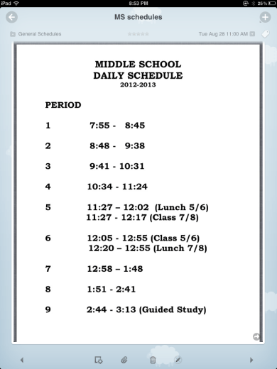 Servicing three different building and many classrooms requires knowing the class schedules of each building. Access to paperless, daily schedules of each building schedule and in service dates in Awesome Note   has helped immensely with organization and scheduling which for me can change from day to day pending student schedules and the need to support AT needs across buildings.