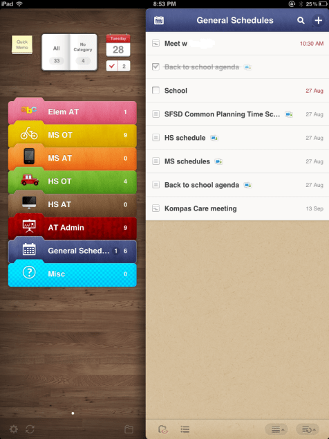 Awesome Note HD – I have been using Awesome Note for several years now and continue to use it due to familiarity and for the features provided which offer me a means to enter OT and AT caseload, admin tasks, schedules and certain meeting notes. Being a visual person, I prefer creating a binder – like existence to organize my notes and artifacts I collect on my students. Available in a version for the iPod and a HD version for the iPad, Awesome Note provides a calendar, sticky notes, to do list, folders that can be color coded and named and the ability to import or take pictures within the notes for archiving samples of student work or other artifacts needed. Here is a sample of what it can look like: