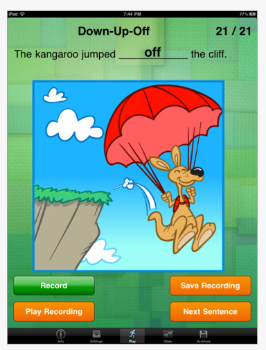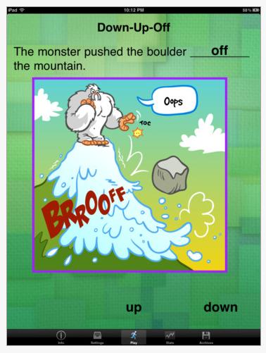 Preposition Builder is a fun iPad app ($7.99) that reinforces preposition use within sentences. The student is presented with a picture, a corresponding sentence, and a choice of three prepositions to choose from to complete the sentence. The student can touch each word to hear it before sliding it into the sentence.