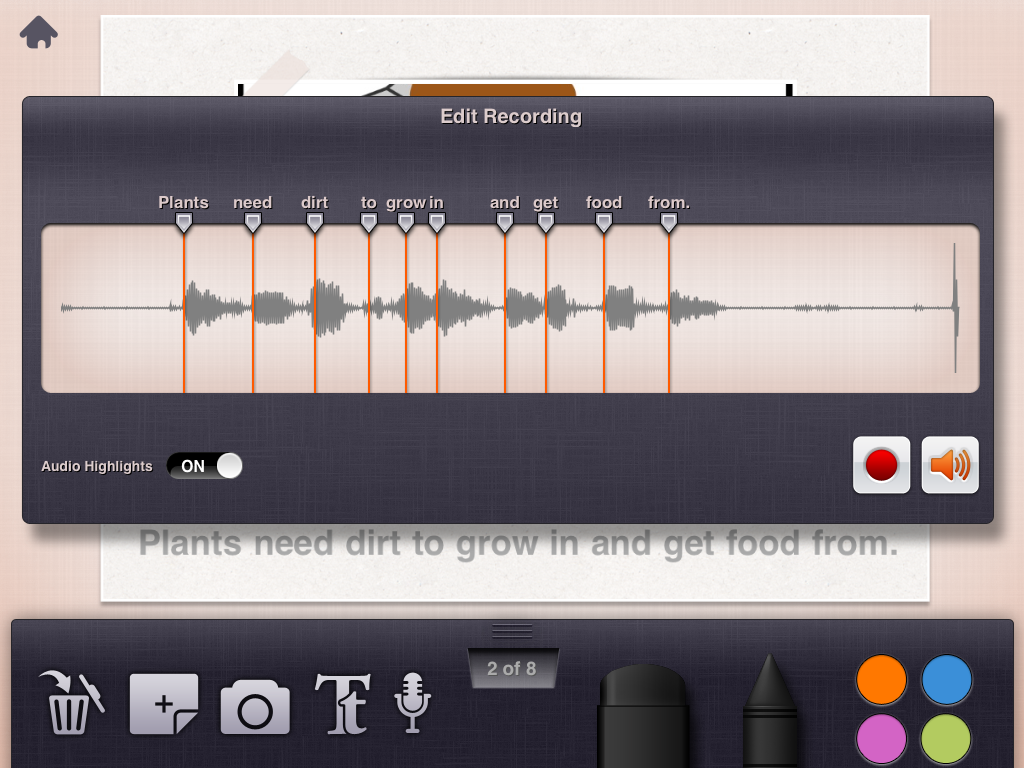 One of the amazing features of Story Creator app is its ability to speak the text word by word that you record. Not only does it allow audio highlighting, but it also allows modification of when it will speak the word using the edit recording feature. This was amazingly intuitive and easy to edit and I am not typically so great at managing and modifying audio.