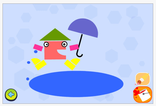 The lite version of Shape Up! provides four geometric pictures to make out of the 20 provided in the full version. Pictures can be reset after drawing them. Tracing over the provided dotted lines of each of the shapes is required to complete the picture which results in an animation. Tracing has to be quite grossly inaccurate for the lines to not be accepted requiring the inaccurate sections to be redone. Tools provided are either a paintbrush or paint can to trace or fill the shapes of the pictures.