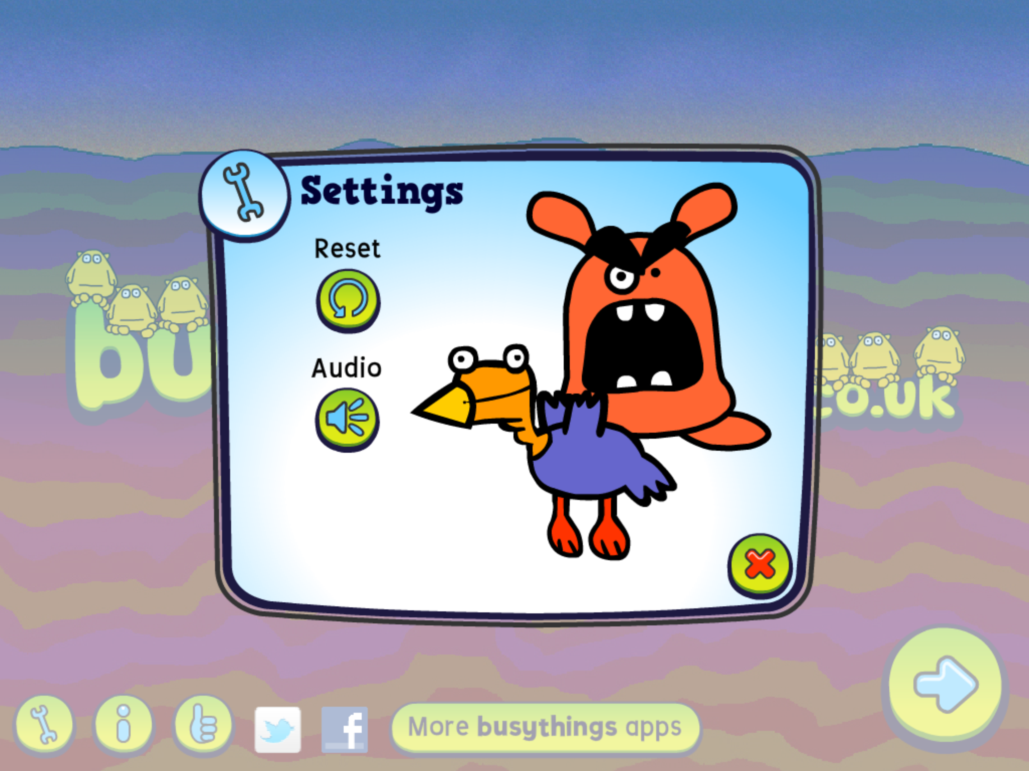 Options within the app are limited. Music and sound effects can be turned off in the settings and the app progress can be reset to start again.