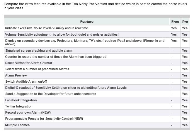There is a free TooNoisy app and a TooNoisy Pro app (1.99). The list below describes the differencesbetween free and the Pro level: