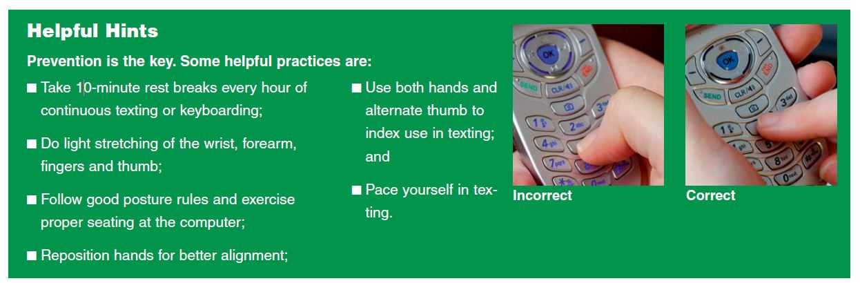 There is a lot of information on the web on the subject. Here is one additional article from Advance for PT: “Texting and Hand Health” : http://physical-therapy.advanceweb.com/Features/Articles/Texting-and-Hand-Health.aspx