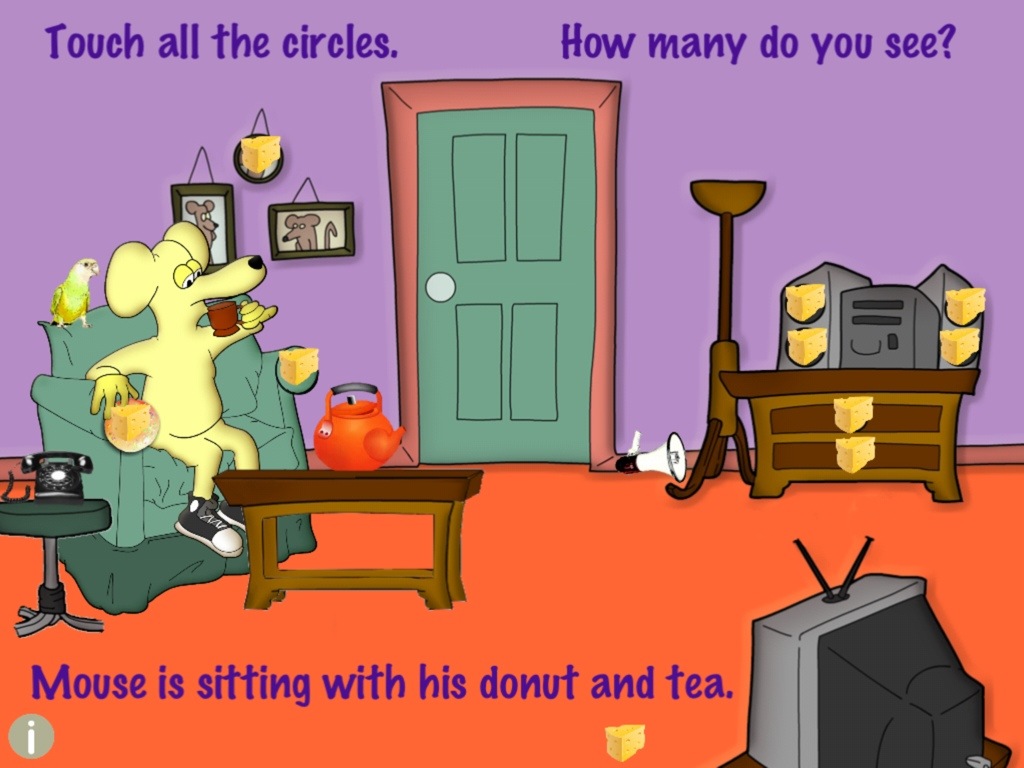 Chunks of cheese lined up at the bottom of the screen represents how many objects or shapes can be found in each room. Animation and cheering is provided when a shape is found and also when all the objects and cheese chunks are assigned. In this first screen of finding circles, the door knob circle did not work leaving a cheese chunk unassigned and no cheering at the end. I used the i button on the bottom left to navigate out of the screen and to the main menu to start with other shapes.